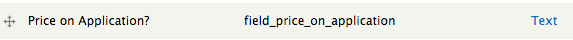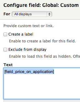 Finally, I created a custom text field, which by default displays the price on application text and in the ‘no results’ section displays the sell price and anything else you want to display. This basically means that the field will display the price on application if there is one, but the price instead, if one is set.
